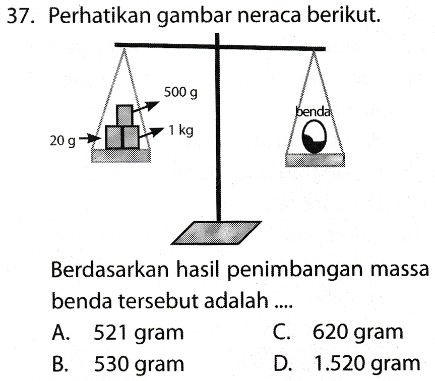 37. Perhatikan gambar neraca berikut. 500 g benda 1 kg 20g Berdasarkan hasil penimbangan massa benda tersebut adalah .... A. 521 gram C. 620 gram B. 530 gram D. 1.520 gram