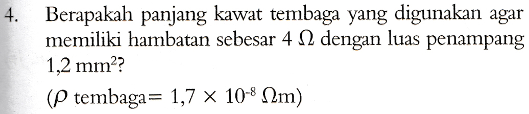 4. Berapakah panjang kawat tembaga yang digunakan agar memiliki hambatan sebesar 4 12 dengan luas penampang 1,2 mm?? (P tembaga= 1,7 x 10-8 Nm)