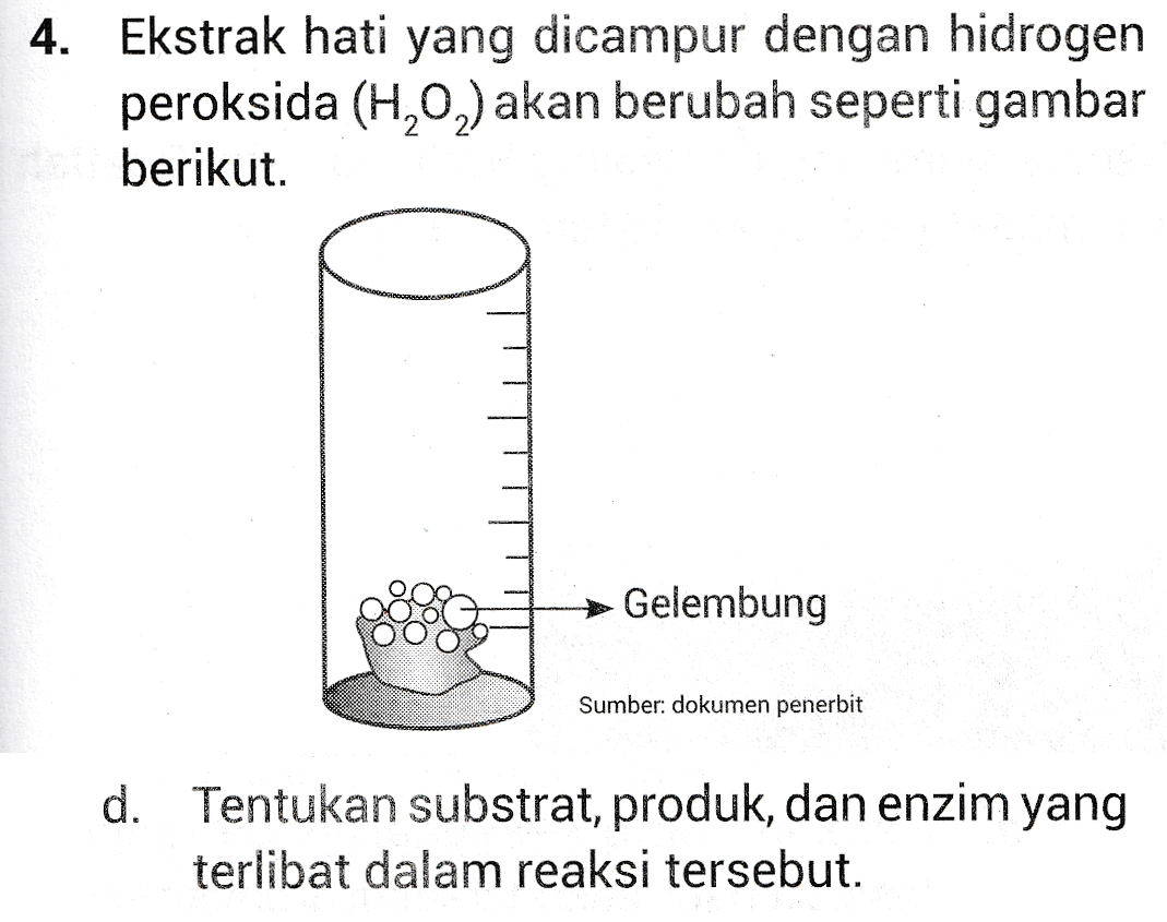 4. Ekstrak hati yang dicampur dengan hidrogen peroksida (H,0,) akan berubah seperti gambar berikut. Gelembung Sumber: dokumen penerbit d. Tentukan substrat, produk, dan enzim yang terlibat dalam reaksi tersebut.
