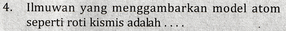 4. Ilmuwan yang menggambarkan model atom seperti roti kismis adalah ....