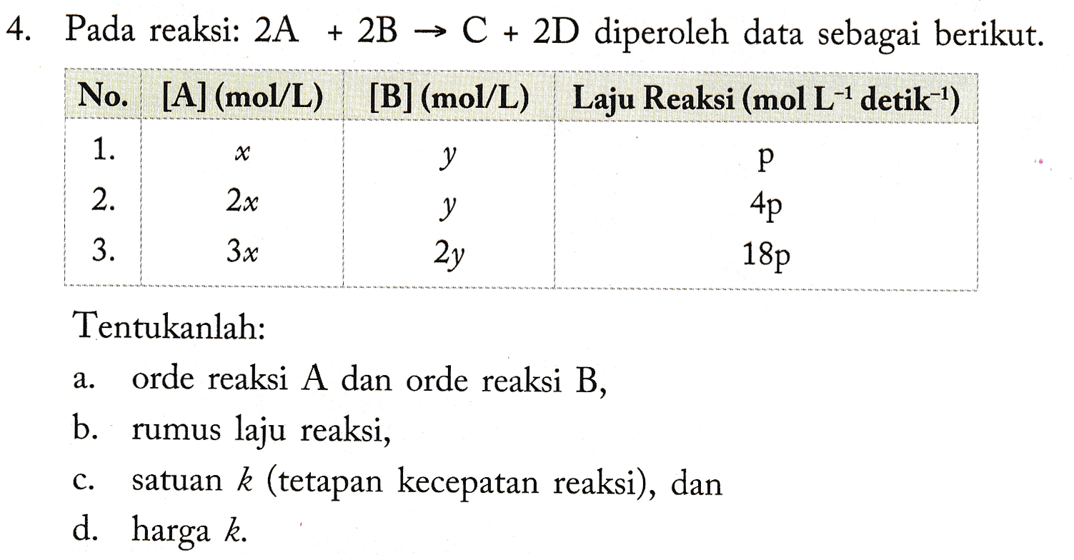 4. Pada reaksi: 2A + 2B → C + 2D diperoleh data sebagai berikut. No. [A] (mol/L) [B] (mol/L) Laju Reaksi (mol L-1 detik-1) LL4 1. у р 2. у 4p 3. 3x X 2x 2y 18p Tentukanlah: a. orde reaksi A dan orde reaksi B, b. rumus laju reaksi, satuan k (tetapan kecepatan reaksi), dan d. harga k. C.