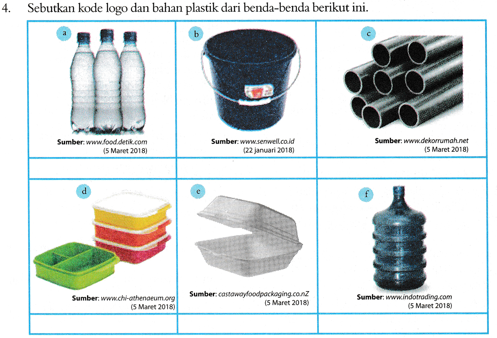 4. Sebutkan kode logo dan bahan plastik dari benda-benda berikut ini. a b C Sumber: www.food.detik.com (5 Maret 2018) Sumber: www.senwell.co.id (22 januari 2018) Sumber: www.dekorrumah.net (5 Maret 2018) d e f Sumber: www.chi-athenaeum.org (5 Maret 2018) Sumber: castawayfoodpackaging.co.nz (5 Maret 2018) Sumber: www.indotrading.com (5 Maret 2018)