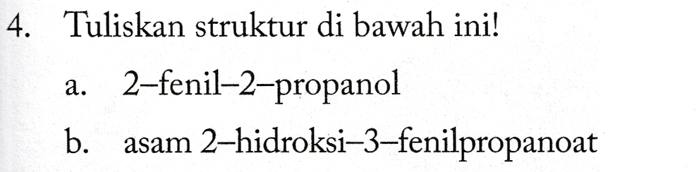 4. Tuliskan struktur di bawah ini! a. 2-fenil-2-propanol 2-hidroksi–3–fenilpropanoat b. asam