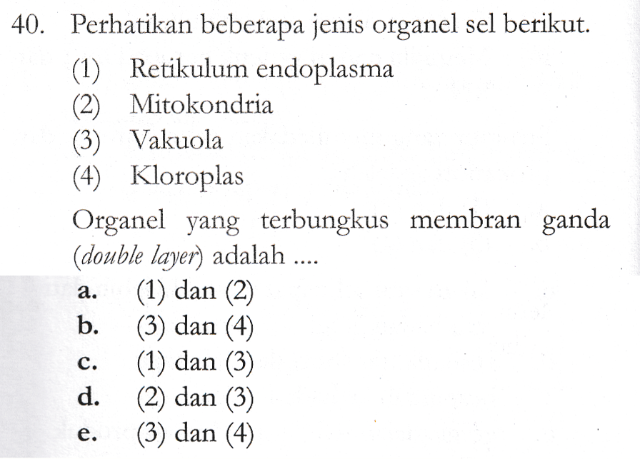 40. Perhatikan beberapa jenis organel sel berikut. (1) Retikulum endoplasma (2) Mitokondria (3) Vakuola (4) Kloroplas Organel yang terbungkus membran ganda (double layer) adalah .... (1) dan (2) . (3) dan (4) (1) dan (3) d. (2) dan (3) (3) dan (4) a