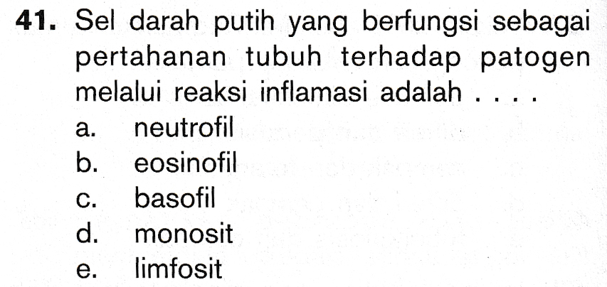 41. Sel darah putih yang berfungsi sebagai pertahanan tubuh terhadap patogen melalui reaksi inflamasi adalah ... neutrofil . eosinofil basofil d. monosit limfosit e.