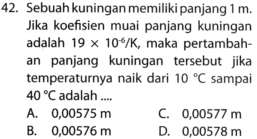 42. Sebuah kuningan memiliki panjang 1 m. Jika koefisien muai panjang kuningan adalah 19 x 10-6/K, maka pertambah- an panjang kuningan tersebut jika temperaturnya naik dari 10 °C sampai 40 °C adalah .... A. 0,00575 m C. 0,00577 m B. 0,00576 m D. 0,00578 m