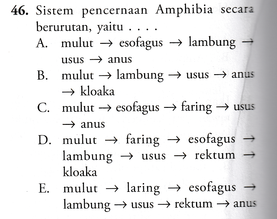 46. Sistem pencernaan Amphibia secara berurutan, yaitu . . A. mulut → esofagus → lambung 1 usus -> anus B. mulut → lambung → usus → anus → kloaka C. mulut → esofagus → faring → usus -> anus D. mulut → faring → esofagus lambung → usus → rektum kloaka E. mulut → laring → esofagus lambung → usus → rektum — anus