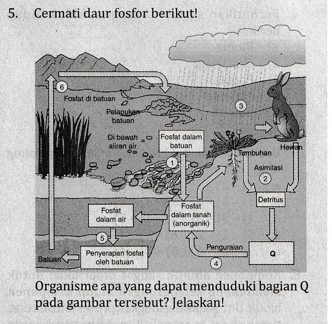 5. Cermati daur fosfor berikut! 6 Fosfat di bafuan 3 Pelapukan batuan Di bawah . Fosfat dalam aliran air batuan E Hewan Tumbuhan Asimilasi Detritus Fosfat dalam air Fosfat dalam tanah (anorganik) Penguraian Q Baluan Penyerapan fosfat oleh batuan Organisme apa yang dapat menduduki bagian Q pada gambar tersebut? Jelaskan!
