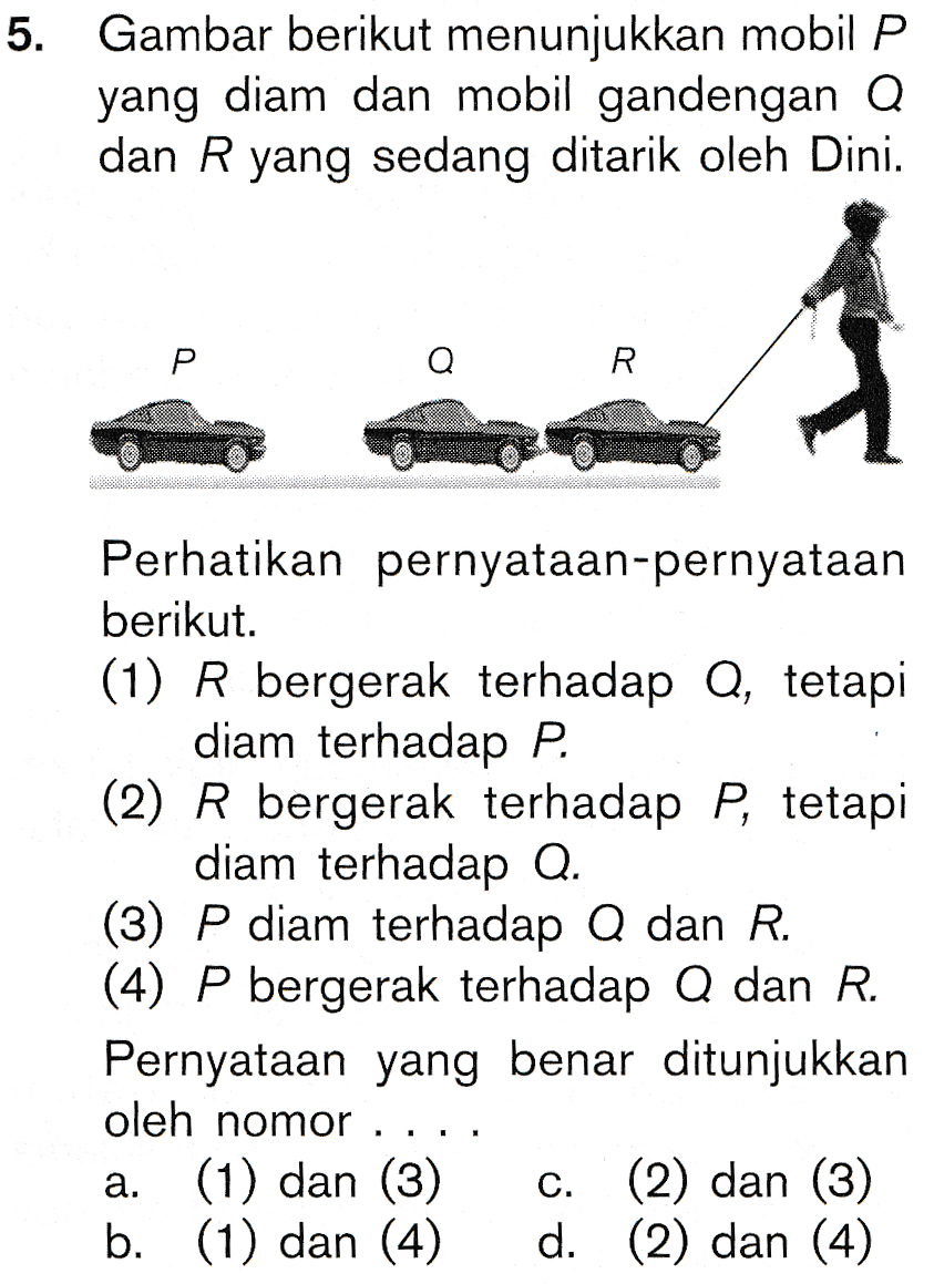 5. Gambar berikut menunjukkan mobil P yang diam dan mobil gandengan Q dan R yang sedang ditarik oleh Dini. Р R Perhatikan pernyataan-pernyataan berikut. (1) R bergerak terhadap a, tetapi diam terhadap P. (2) R bergerak terhadap P, tetapi diam terhadap Q. (3) P diam terhadap Q dan R. (4) P bergerak terhadap Q dan R. Pernyataan yang benar ditunjukkan oleh nomor (1) dan (3) C. (2) dan (3) b. (1) dan (4) d. (2) dan (4) a.