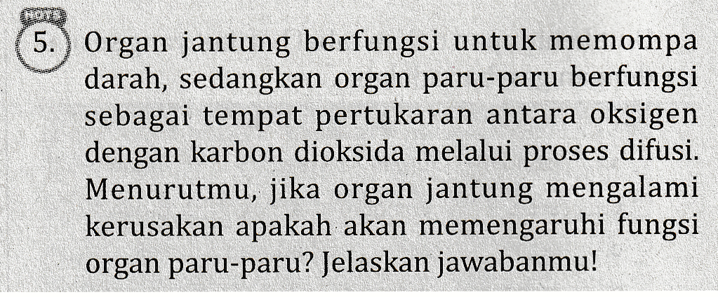 5.) Organ jantung berfungsi untuk memompa darah, sedangkan organ paru-paru berfungsi sebagai tempat pertukaran antara oksigen dengan karbon dioksida melalui proses difusi. Menurutmu, jika organ jantung mengalami kerusakan apakah akan memengaruhi fungsi organ paru-paru? Jelaskan jawabanmu!