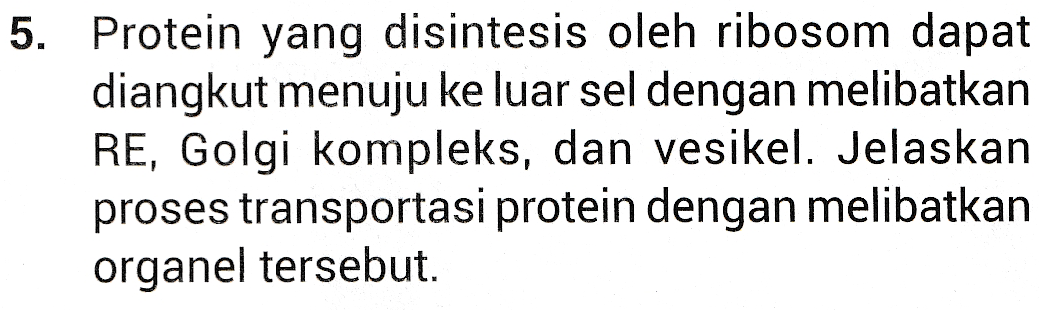 5. Protein yang disintesis oleh ribosom dapat diangkut menuju ke luar sel dengan melibatkan RE, Golgi kompleks, dan vesikel. Jelaskan proses transportasi protein dengan melibatkan organel tersebut.