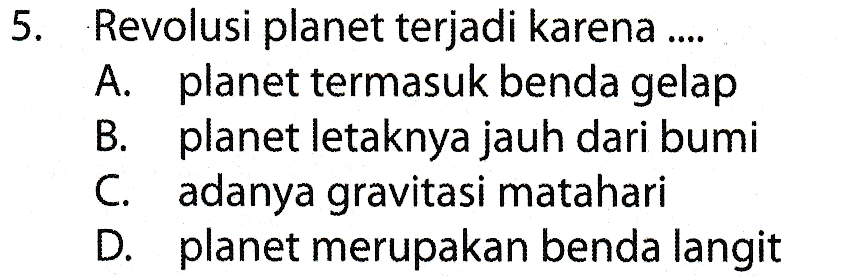 5. Revolusi planet terjadi karena .... A. planet termasuk benda gelap B. planet letaknya jauh dari bumi C. adanya gravitasi matahari D. planet merupakan benda langit