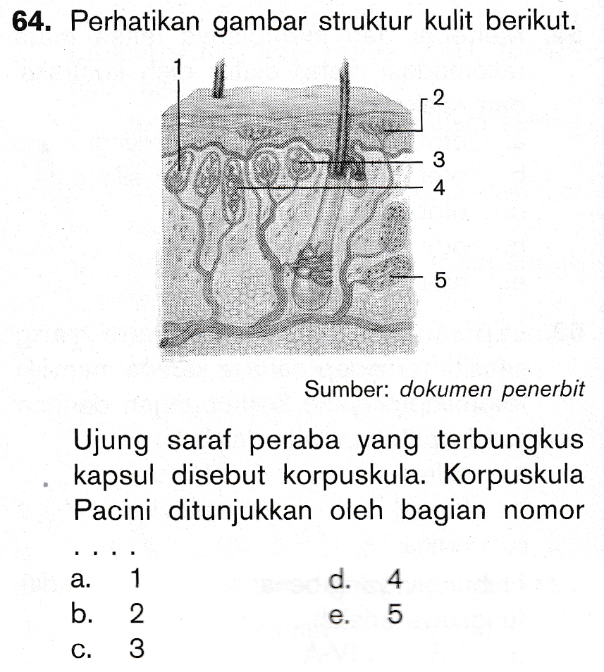 64. Perhatikan gambar struktur kulit berikut. 1 2 ICAL 3 4 25 Sumber: dokumen penerbit Ujung saraf peraba yang terbungkus kapsul disebut korpuskula. Korpuskula Pacini ditunjukkan oleh bagian nomor 1 d. 4 ی و نه 2 e. 5 3