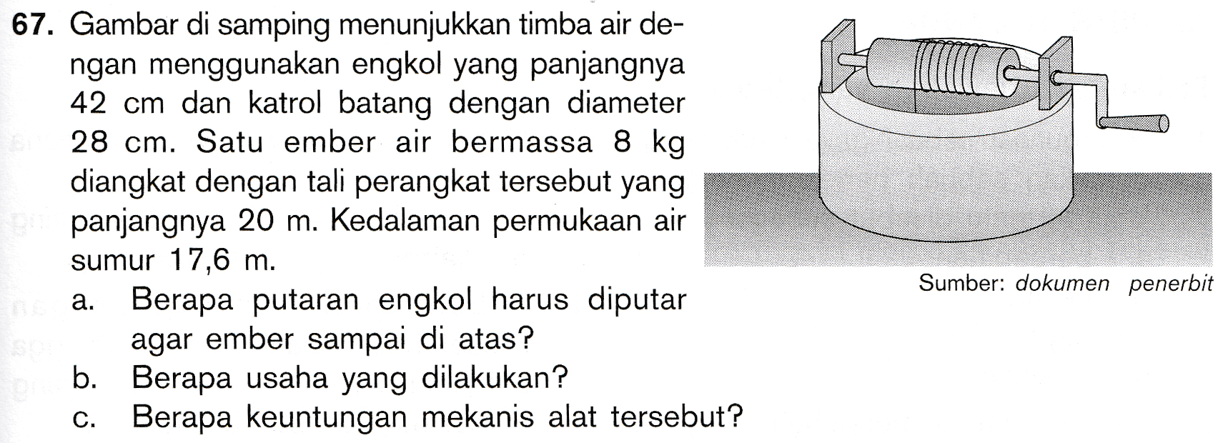 67. Gambar di samping menunjukkan timba air de- ngan menggunakan engkol yang panjangnya 42 cm dan katrol batang dengan diameter 28 cm. Satu ember air bermassa 8 kg diangkat dengan tali perangkat tersebut yang panjangnya 20 m. Kedalaman permukaan air sumur 17,6 m. a. Berapa putaran engkol harus diputar agar ember sampai di atas? b. Berapa usaha yang dilakukan? Berapa keuntungan mekanis alat tersebut? Sumber: dokumen penerbit C.