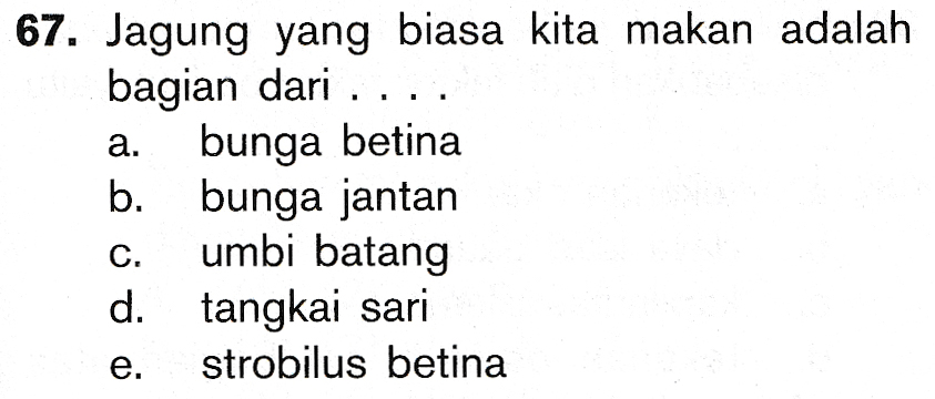 67. Jagung yang biasa kita makan adalah bagian dari .. bunga betina . bunga jantan umbi batang d. tangkai sari strobilus betina که ی و نه