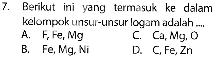 7. Berikut ini yang termasuk ke dalam kelompok unsur-unsur logam adalah .... A. F, Fe, Mg C. Ca, Mg, O B. Fe, Mg, Ni D. C, Fe, Zn
