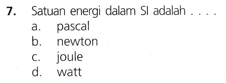 7. Satuan energi dalam Si adalah . a. pascal b. newton C. joule d. watt