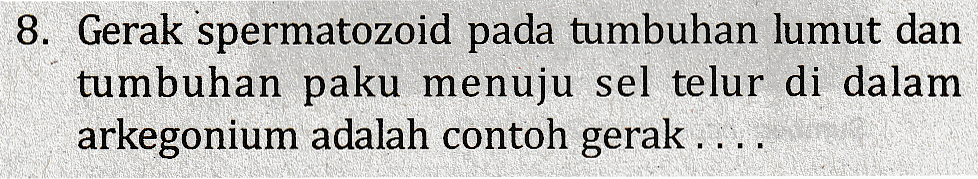 8. Gerak spermatozoid pada tumbuhan lumut dan tumbuhan paku menuju sel telur di dalam arkegonium adalah contoh gerak ....