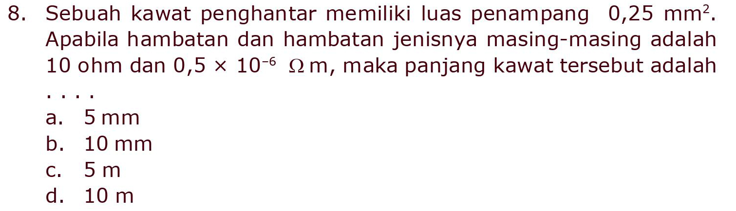 8. Sebuah kawat penghantar memiliki luas penampang 0,25 mm?. Apabila hambatan dan hambatan jenisnya masing-masing adalah 10 ohm dan 0,5 x 10-6 2 m, maka panjang kawat tersebut adalah 1 I a. 5 mm b. 10 mm C. 5 m d. 10 m