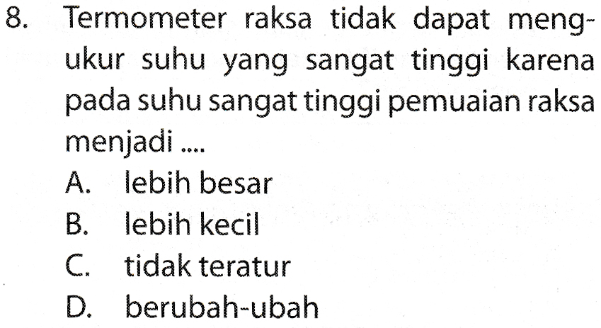 8. Termometer raksa tidak dapat meng- ukur suhu yang sangat tinggi karena pada suhu sangat tinggi pemuaian raksa menjadi .... A. lebih besar B. lebih kecil C. tidak teratur D. berubah-ubah