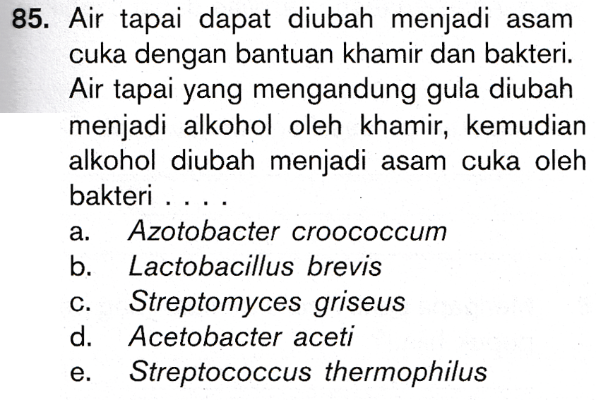 85. Air tapai dapat diubah menjadi asam cuka dengan bantuan khamir dan bakteri. Air tapai yang mengandung gula diubah menjadi alkohol oleh khamir, kemudian alkohol diubah menjadi asam cuka oleh bakteri .... a Azotobacter croococcum b. Lactobacillus brevis Streptomyces griseus d. Acetobacter aceti Streptococcus thermophilus e.