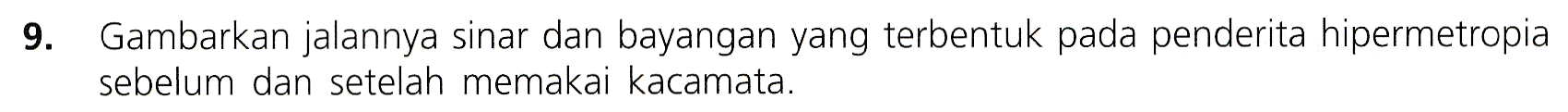 9. Gambarkan jalannya sinar dan bayangan yang terbentuk pada penderita hipermetropia sebelum dan setelah memakai kacamata.