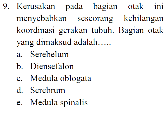 9. Kerusakan pada bagian otak ini menyebabkan seseorang kehilangan koordinasi gerakan tubuh. Bagian otak yang dimaksud adalah..... a. Serebelum b. Diensefalon c. Medula oblogata d. Serebrum e. Medula spinalis