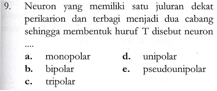 9. Neuron yang memiliki satu juluran dekat perikarion dan terbagi menjadi dua cabang sehingga membentuk huruf T disebut neuron a. monopolar bipolar tripolar d. unipolar pseudounipolar b. e. C.
