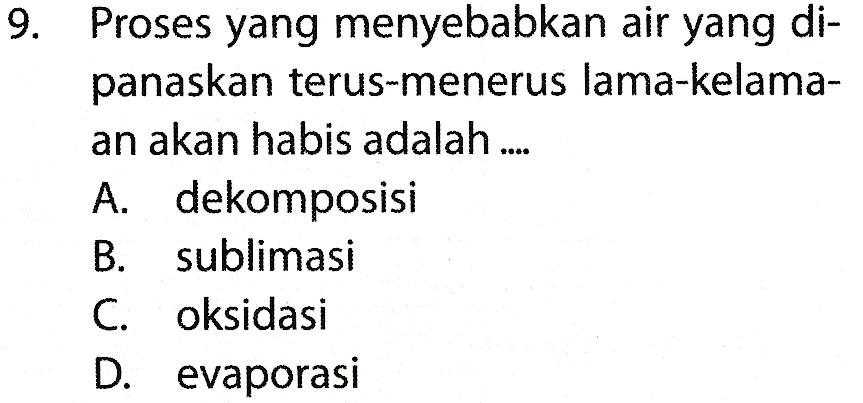 9. Proses yang menyebabkan air yang di- panaskan terus-menerus lama-kelama- an akan habis adalah .... A. dekomposisi B. sublimasi C. oksidasi D. evaporasi