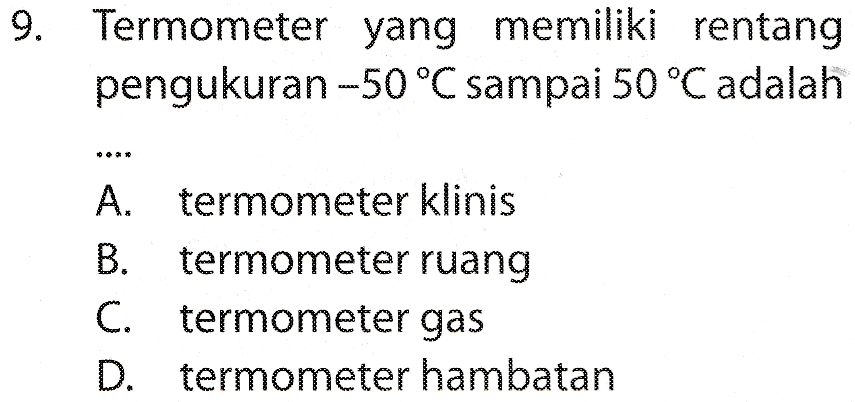 9. Termometer yang memiliki rentang pengukuran -50°C sampai 50°C adalah 80 A. termometer klinis B. termometer ruang C. termometer gas D. termometer hambatan