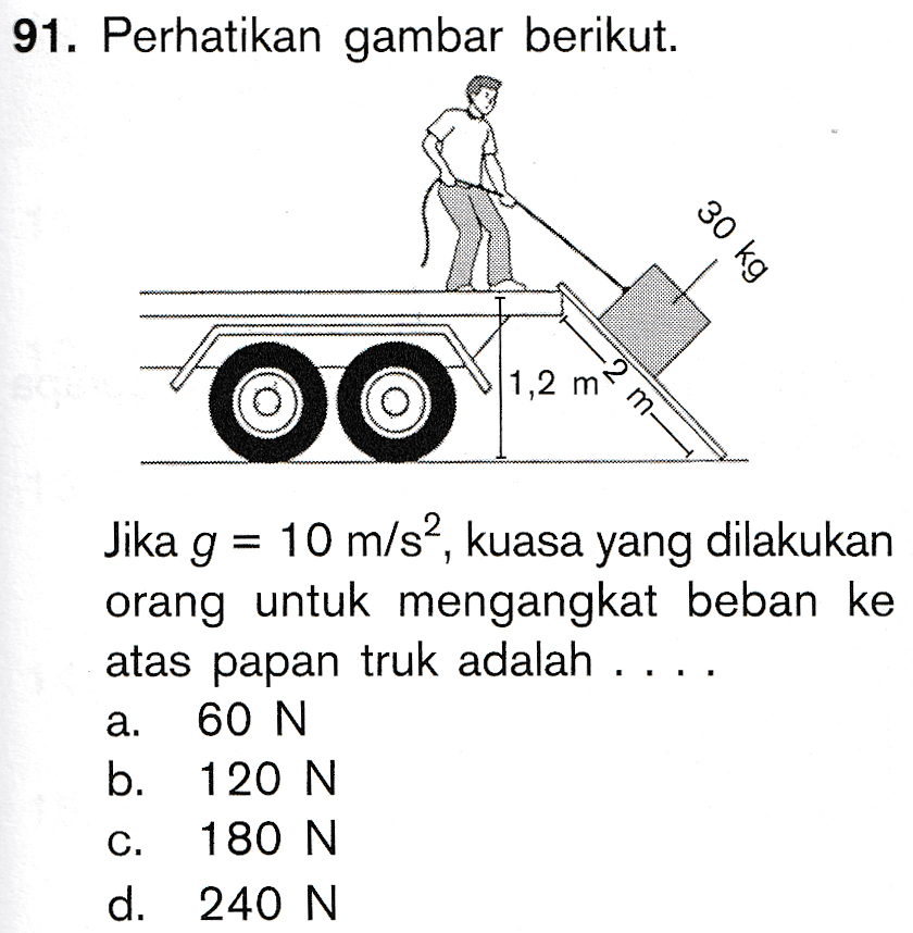 91. Perhatikan gambar berikut. 30 kg OO 1,2 m -2 m ա Jika g = 10 m/s?, kuasa yang dilakukan orang untuk mengangkat beban ke atas papan truk adalah 60 N b. 120 N 180 N d. 240 N a. C.
