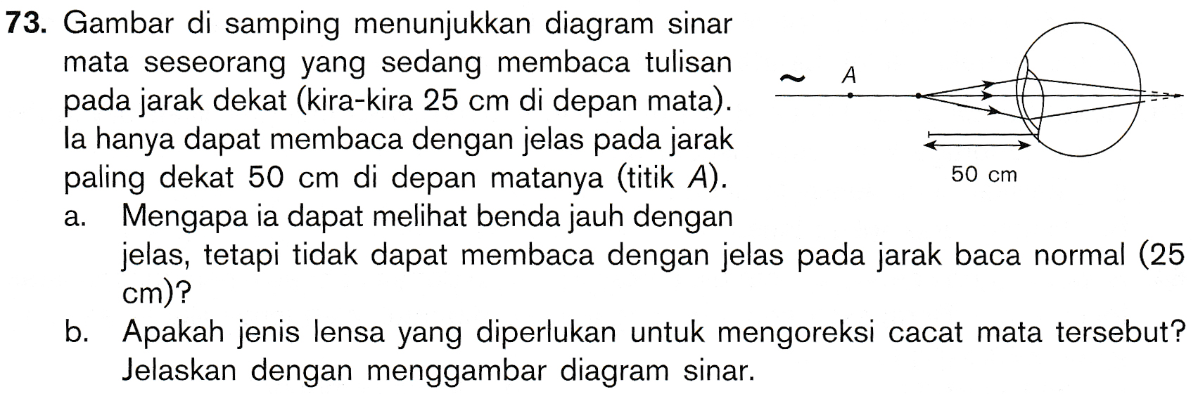 A А. 50 cm 73. Gambar di samping menunjukkan diagram sinar mata seseorang yang sedang membaca tulisan pada jarak dekat (kira-kira 25 cm di depan mata). la hanya dapat membaca dengan jelas pada jarak paling dekat 50 cm di depan matanya (titik A). a. Mengapa ia dapat melihat benda jauh dengan jelas, tetapi tidak dapat membaca dengan jelas pada jarak baca normal (25 cm)? b. Apakah jenis lensa yang diperlukan untuk mengoreksi cacat mata tersebut? Jelaskan dengan menggambar diagram sinar.