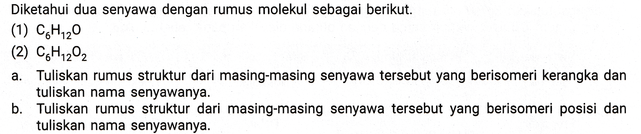 Diketahui dua senyawa dengan rumus molekul sebagai berikut. (1) CH120 (2) C6H1202 Tuliskan rumus struktur dari masing-masing senyawa tersebut yang berisomeri kerangka dan tuliskan nama senyawanya. b. Tuliskan rumus struktur dari masing-masing senyawa tersebut yang berisomeri posisi dan tuliskan nama senyawanya. a.
