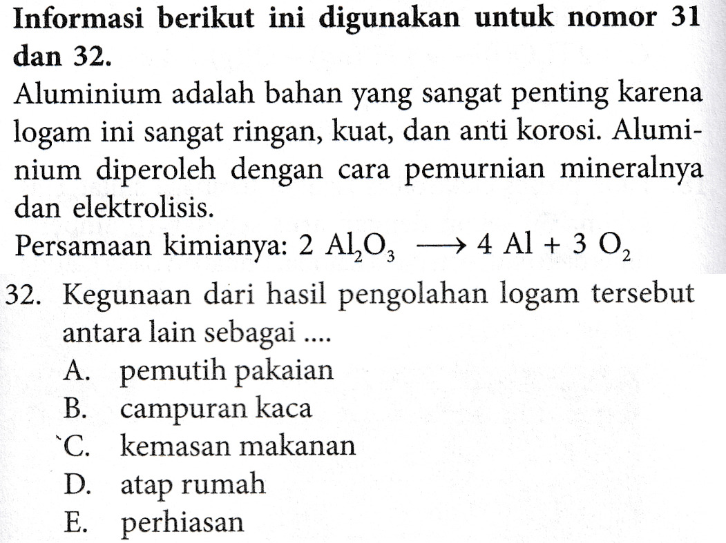 Informasi berikut ini digunakan untuk nomor 31 dan 32. Aluminium adalah bahan yang sangat penting karena logam ini sangat ringan, kuat, dan anti korosi. Alumi- nium diperoleh dengan cara pemurnian mineralnya dan elektrolisis. Persamaan kimianya: 2 ALO, -→ 4 Al + 3 02 32. Kegunaan dari hasil pengolahan logam tersebut antara lain sebagai .... A. pemutih pakaian B. campuran kaca 'C. kemasan makanan D. atap rumah E. perhiasan