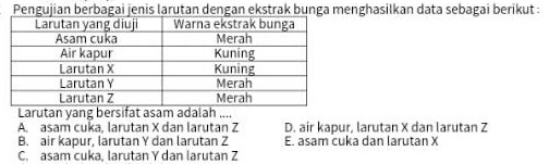 Pengujian berbagai jenis larutan dengan ekstrak bunga menghasilkan data sebagai berikut: Larutan yang diuji Warna ekstrak bunga Asam cuka Merah Air kapur Kuning Larutan X Kuning Larutan Y Merah Larutan Z Merah Larutan yang bersifat asam adalah .... A asam cuka, larutan X dan larutan Z D. air kapur, larutan X dan larutan Z B. air kapur, larutan Y dan larutan Z E. asam cuka dan larutan X C. asam cuka, larutan Y dan larutan Z