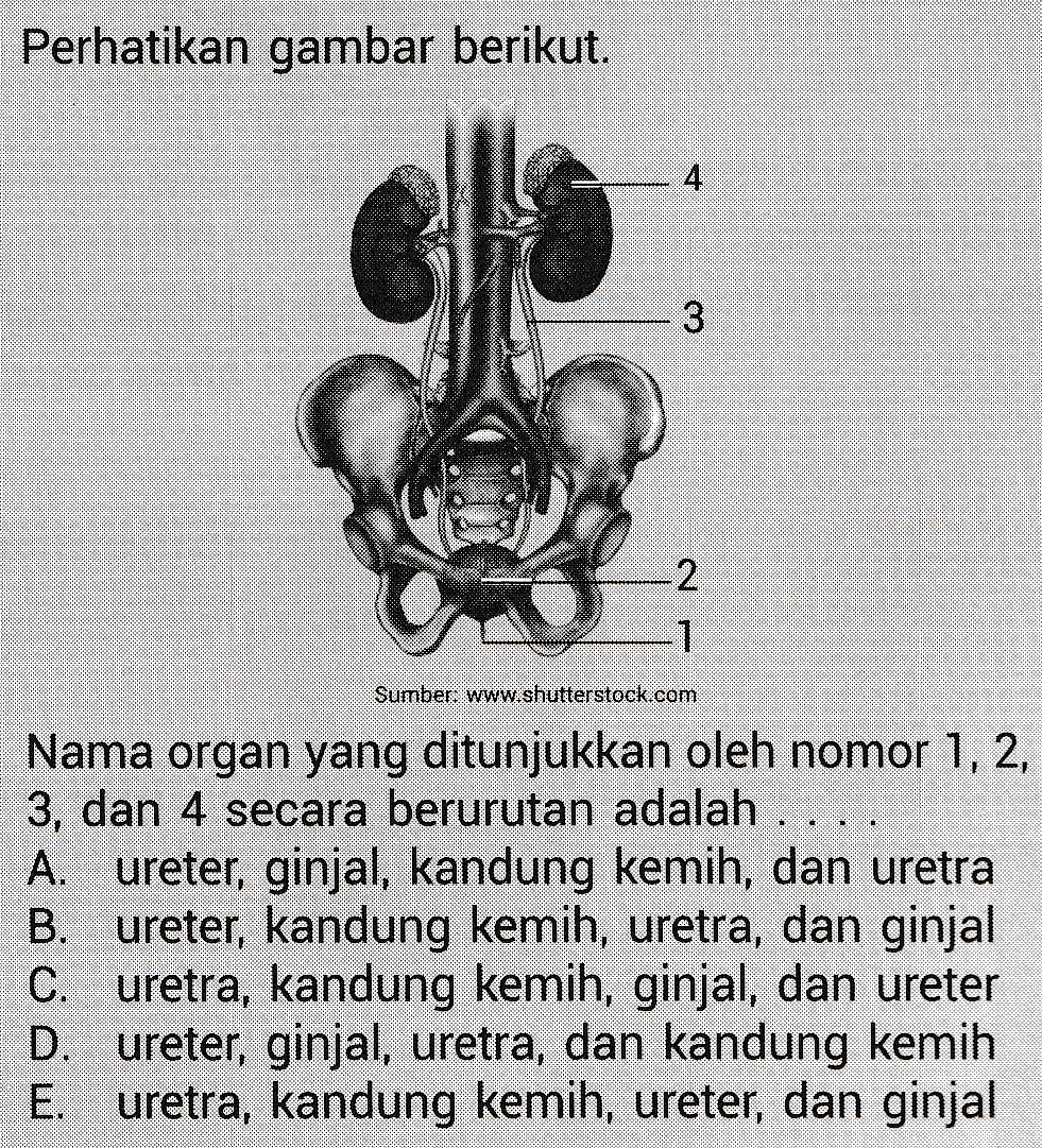 Perhatikan gambar berikut. 4 3 2 1 Sumber www.shutterstock.com 1 CONNESS Nama organ yang ditunjukkan oleh nomor 1, 2, 3, dan 4 secara berurutan adalah A. ureter, ginjal, kandung kemih, dan uretra B. ureter, kandung kemih, uretra, dan ginjal C. uretra, kandung kemih, ginjal, dan ureter D. ureter, ginjal, uretra, dan kandung kemih E. uretra, kandung kemih, ureter, dan ginjal