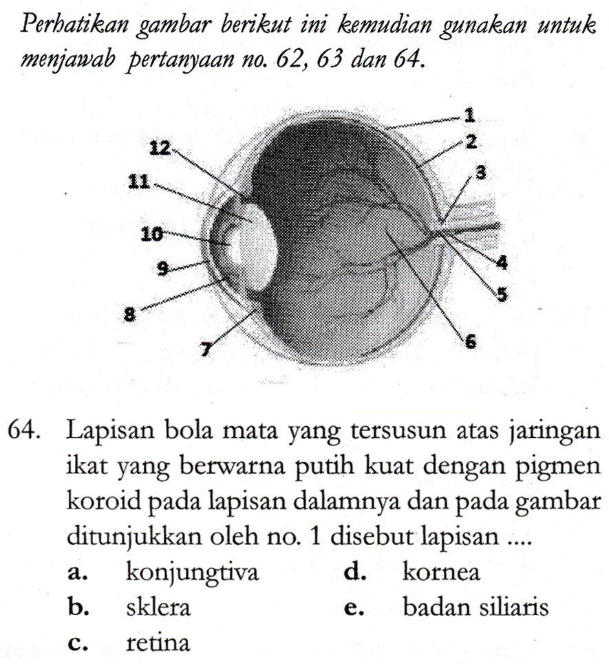 Perhatikan gambar berikut ini kemudian gunakan untuk menjawab pertanyaan no. 62, 63 dan 64. 12 8 64. Lapisan bola mata yang tersusun atas jaringan ikat yang berwarna putih kuat dengan pigmen koroid pada lapisan dalamnya dan pada gambar ditunjukkan oleh no. 1 disebut lapisan .... konjungtiva d. kornea b. sklera badan siliaris retina a. e. c.