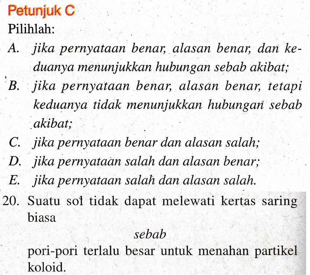 Petunjuk C Pilihlah: A. jika pernyataan benar, alasan benar, dan ke- duanya menunjukkan hubungan sebab akibat; B. jika pernyataan benar, alasan benar, tetapi keduanya tidak menunjukkan hubungan sebab akibat; C. jika pernyataan benar dan alasan salah; D. jika pernyataan salah dan alasan benar; E. jika pernyataan salah dan alasan salah. 20. Suatu sol tidak dapat melewati kertas saring biasa sebab pori-pori terlalu besar untuk menahan partikel koloid.