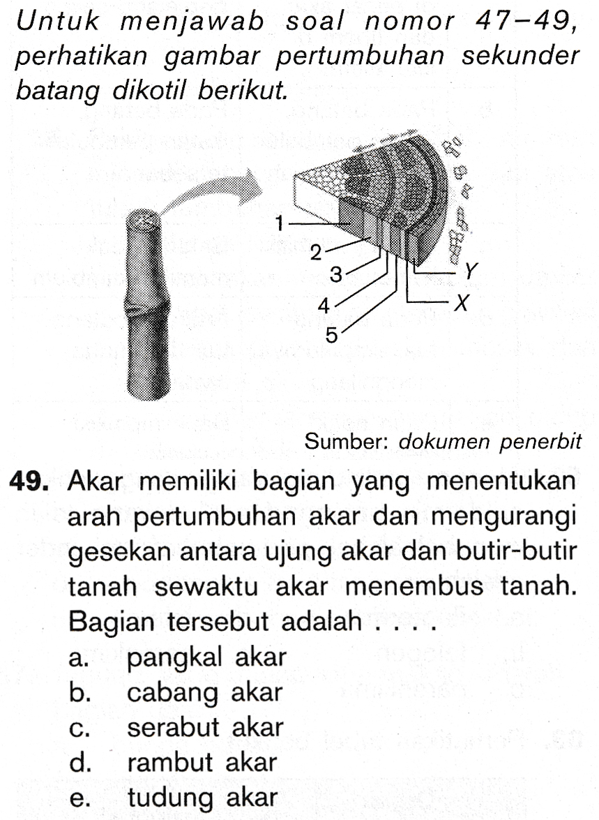 Untuk menjawab soal nomor 47-49, perhatikan gambar pertumbuhan sekunder batang dikotil berikut. 1 3 4 -X Sumber: dokumen penerbit 49. Akar memiliki bagian yang menentukan arah pertumbuhan akar dan mengurangi gesekan antara ujung akar dan butir-butir tanah sewaktu akar menembus tanah. Bagian tersebut adalah pangkal akar b. cabang akar serabut akar d. rambut akar tudung akar a. C. e.
