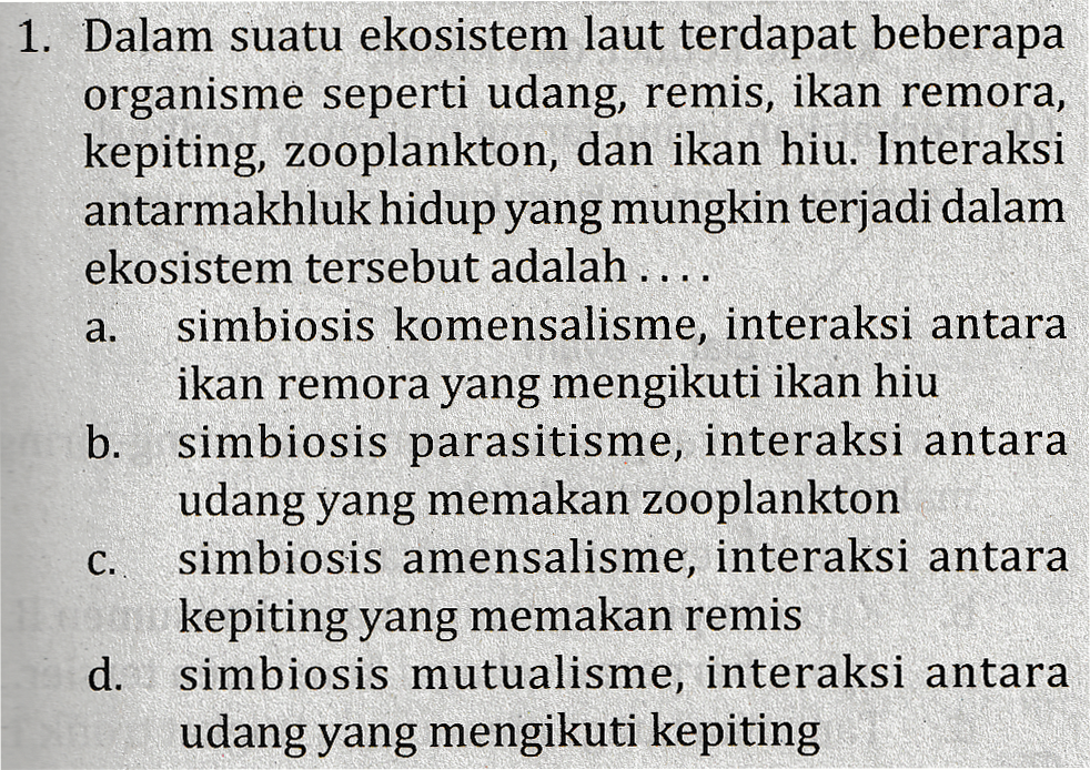 a. 1. Dalam suatu ekosistem laut terdapat beberapa organisme seperti udang, remis, ikan remora, kepiting, zooplankton, dan ikan hiu. Interaksi antarmakhluk hidup yang mungkin terjadi dalam ekosistem tersebut adalah .. simbiosis komensalisme, interaksi antara ikan remora yang mengikuti ikan hiu b. simbiosis parasitisme, interaksi antara udang yang memakan zooplankton C. simbiosis amensalisme, interaksi antara kepiting yang memakan remis d. simbiosis mutualisme, interaksi antara udang yang mengikuti kepiting