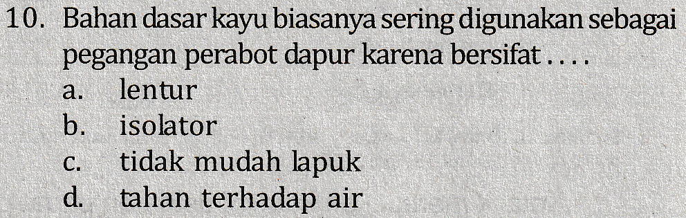 a. 10. Bahan dasar kayu biasanya sering digunakan sebagai pegangan perabot dapur karena bersifat .... lentur b. isolator tidak mudah lapuk d. tahan terhadap air C.