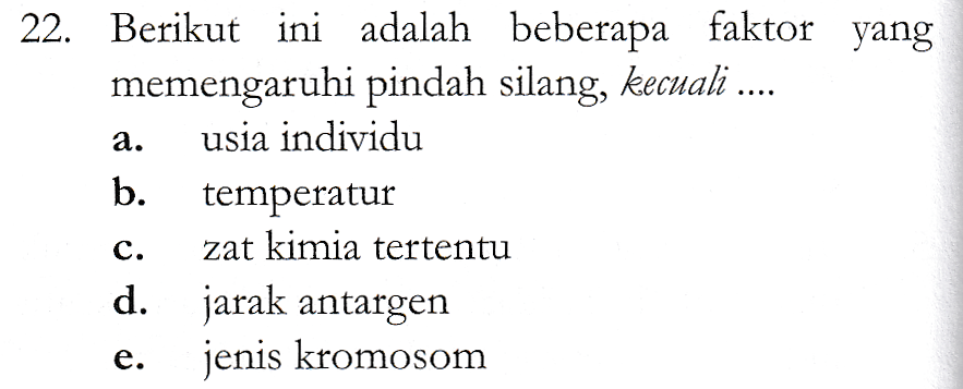 a. 22. Berikut ini adalah beberapa faktor yang memengaruhi pindah silang, kecuali .... usia individu b. temperatur zat kimia tertentu d. jarak antargen jenis kromosom C. e.