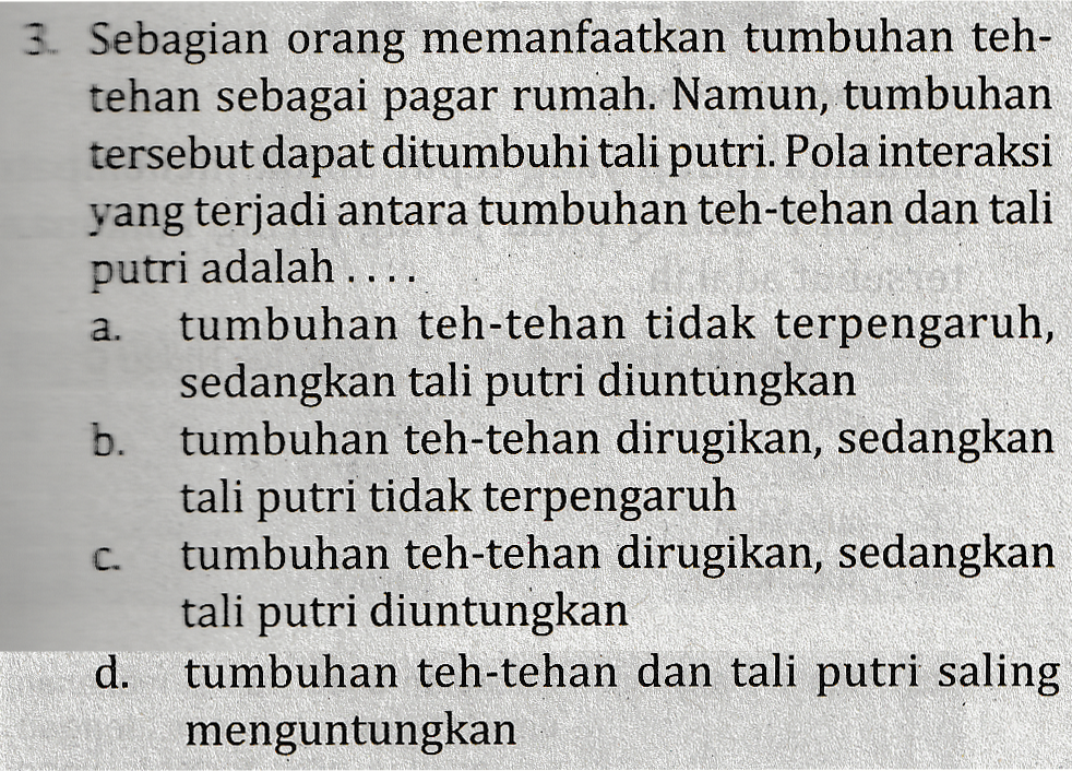 a. 3. Sebagian orang memanfaatkan tumbuhan teh- tehan sebagai pagar rumah. Namun, tumbuhan tersebut dapat ditumbuhi tali putri. Pola interaksi yang terjadi antara tumbuhan teh-tehan dan tali putri adalah .... tumbuhan teh-tehan tidak terpengaruh, sedangkan tali putri diuntungkan b. tumbuhan teh-tehan dirugikan, sedangkan tali putri tidak terpengaruh tumbuhan teh-tehan dirugikan, sedangkan tali putri diuntungkan d. tumbuhan teh-tehan dan tali putri saling menguntungkan C.