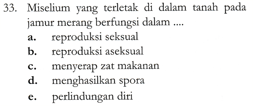 a. 33. Miselium yang terletak di dalam tanah pada jamur merang berfungsi dalam .... reproduksi seksual b. reproduksi aseksual menyerap zat makanan d. menghasilkan spora perlindungan diri C. e.