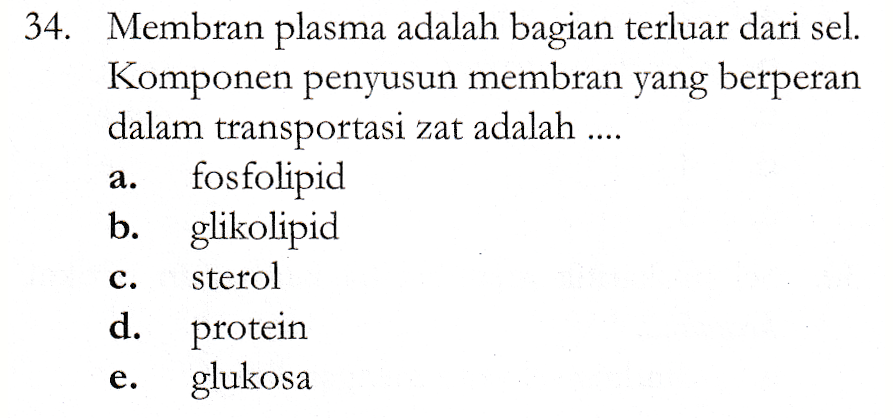 a. 34. Membran plasma adalah bagian terluar dari sel. Komponen penyusun membran yang berperan dalam transportasi zat adalah .... fosfolipid b. glikolipid sterol d. protein glukosa C. e.