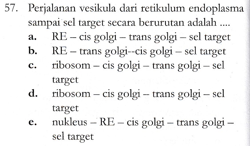 a. 57. Perjalanan vesikula dari retikulum endoplasma sampai sel target secara berurutan adalah .... RE – cis golgi – trans golgi – sel target b. RE - trans golgi--cis golgi- sel target ribosom – cis golgi – trans golgi – sel target d. ribosom - cis golgi – trans golgi – sel target nukleus – RE – cis golgi – trans golgi – C. e. sel target