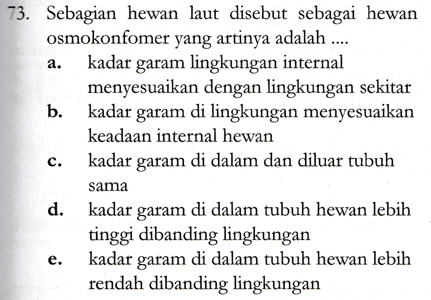 a. 73. Sebagian hewan laut disebut sebagai hewan osmokonfomer yang artinya adalah .... kadar garam lingkungan internal menyesuaikan dengan lingkungan sekitar b. kadar garam di lingkungan menyesuaikan keadaan internal hewan kadar garam di dalam dan diluar tubuh sama d. kadar garam di dalam tubuh hewan lebih tinggi dibanding lingkungan kadar garam di dalam tubuh hewan lebih rendah dibanding lingkungan C. e.
