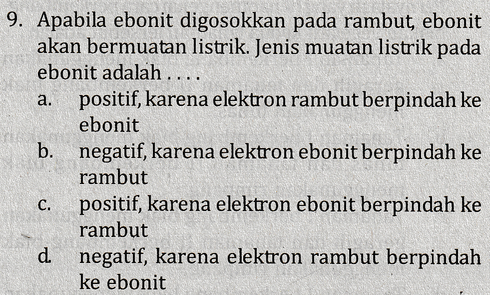 a. 9. Apabila ebonit digosokkan pada rambut ebonit akan bermuatan listrik. Jenis muatan listrik pada ebonit adalah .... positif, karena elektron rambut berpindah ke ebonit b. negatif, karena elektron ebonit berpindah ke rambut positif, karena elektron ebonit berpindah ke rambut d negatif, karena elektron rambut berpindah ke ebonit C.