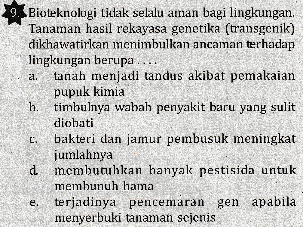 a. 9. Bioteknologi tidak selalu aman bagi lingkungan. Tanaman hasil rekayasa genetika (transgenik) dikhawatirkan menimbulkan ancaman terhadap lingkungan berupa ..., tanah menjadi tandus akibat pemakaian pupuk kimia b. timbulnya wabah penyakit baru yang sulit diobati bakteri dan jamur pembusuk meningkat jumlahnya d membutuhkan banyak pestisida untuk membunuh hama terjadinya pencemaran gen apabila menyerbuki tanaman sejenis C. e.