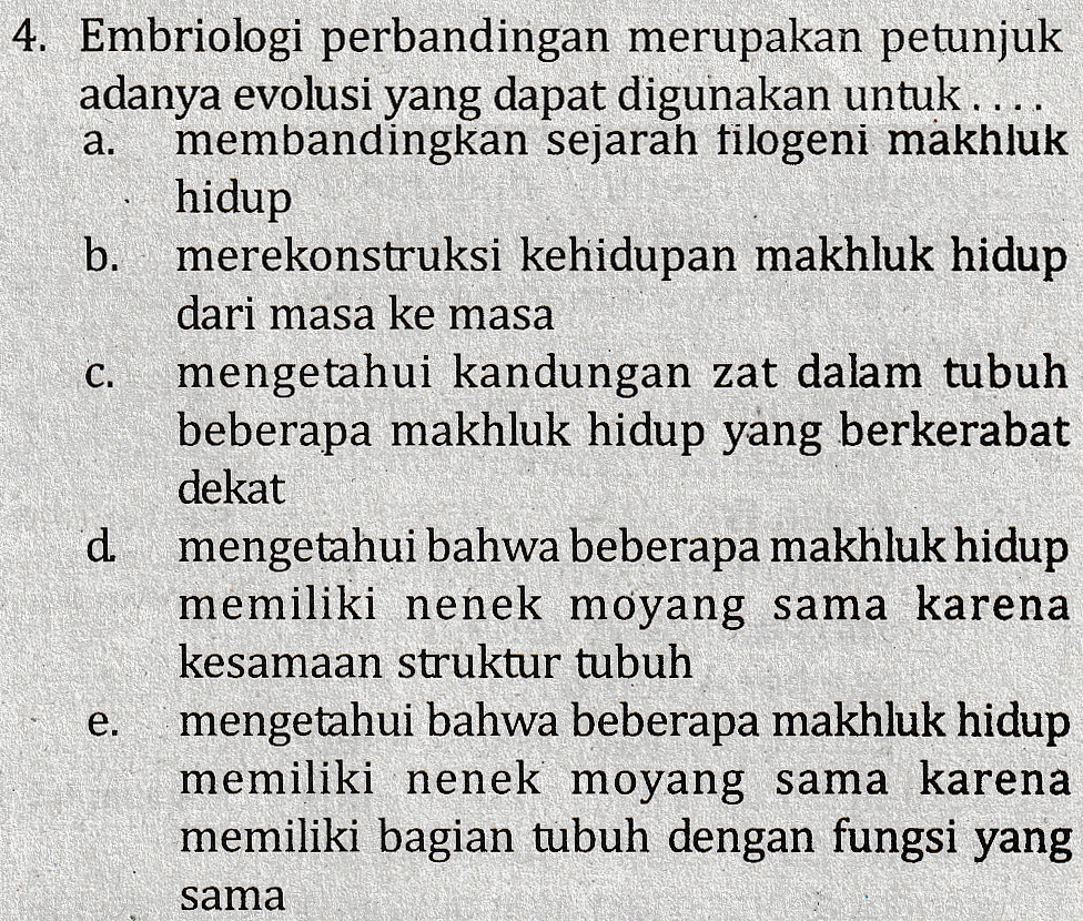 a. C. 4. Embriologi perbandingan merupakan petunjuk adanya evolusi yang dapat digunakan untuk... membandingkan sejarah filogeni makhluk hidup b. merekonstruksi kehidupan makhluk hidup dari masa ke masa mengetahui kandungan zat dalam tubuh beberapa makhluk hidup yang berkerabat dekat d mengetahui bahwa beberapa makhluk hidup memiliki nenek moyang sama karena kesamaan struktur tubuh mengetahui bahwa beberapa makhluk hidup memiliki nenek moyang sama karena memiliki bagian tubuh dengan fungsi yang e. sama
